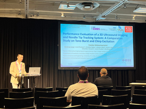 We are also proud to share that Weidong (James) Liang, a PhD student in our group, delivered an excellent oral presentation at EMBC 2025. His talk, titled "Performance Evaluation of a 3D Ultrasound Imaging and Needle Tip Tracking System: A Comparative Study on Tone-Burst and Chirp Excitation", presented a thorough comparison between different excitation strategies in 3D ultrasound-guided needle tracking. His work was well received by the community and stimulated engaging technical discussions.